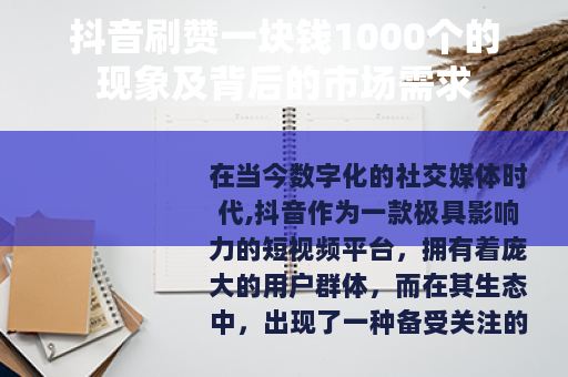 在当今数字化的社交媒体时代,抖音作为一款极具影响力的短视频平台,拥有着庞大的用户群体,而在其生态中,出现了一种备受关注的现象,那就是所谓的抖音刷赞一块钱1000个的服务。