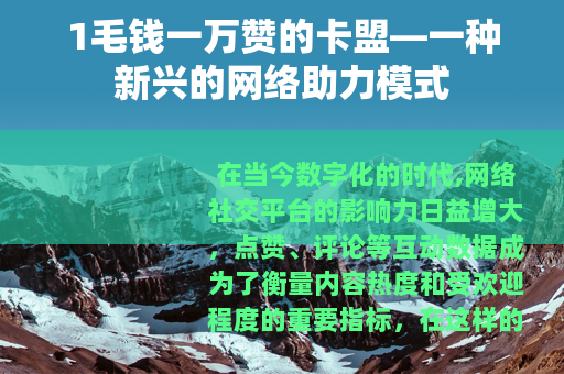 在当今数字化的时代,网络社交平台的影响力日益增大,点赞、评论等互动数据成为了衡量内容热度和受欢迎程度的重要指标,在这样的背景下,一种名为“1毛钱一万赞的卡盟”的现象逐渐兴起,引起了众多人的关注。
