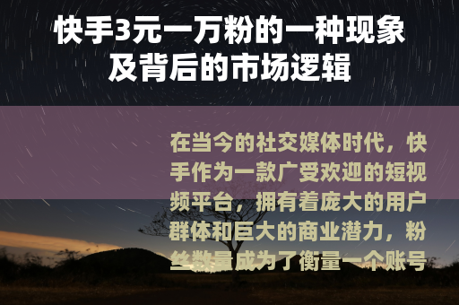 在当今的社交媒体时代,快手作为一款广受欢迎的短视频平台,拥有着庞大的用户群体和巨大的商业潜力,粉丝数量成为了衡量一个账号影响力和价值的重要指标之一,而“快手3元一万粉”这样的现象也逐渐在一些角落里出现,引发了人们的关注和讨论。
