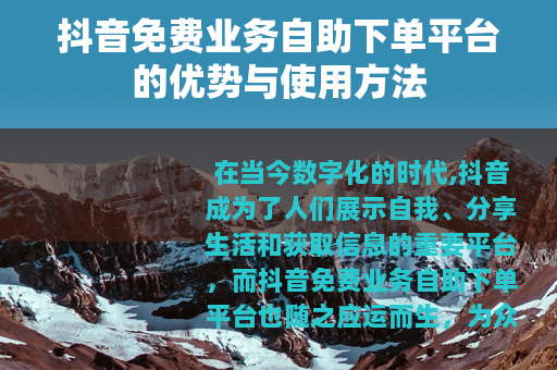 在当今数字化的时代,抖音成为了人们展示自我、分享生活和获取信息的重要平台,而抖音免费业务自助下单平台也随之应运而生,为众多用户提供了便利与更多的可能性。