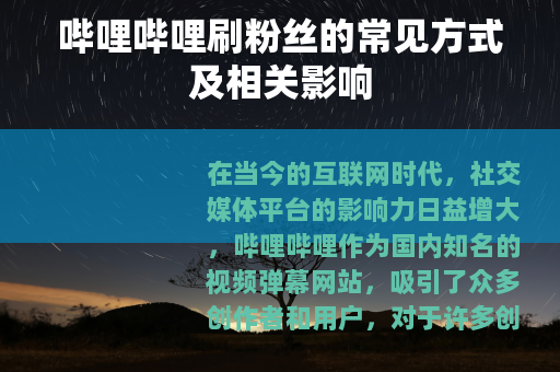 在当今的互联网时代,社交媒体平台的影响力日益增大,哔哩哔哩作为国内知名的视频弹幕网站,吸引了众多创作者和用户,对于许多创作者来说,拥有大量的粉丝是他们在平台上取得成功的重要标志之一,哔哩哔哩刷粉丝的现象也逐渐引起了人们的关注。