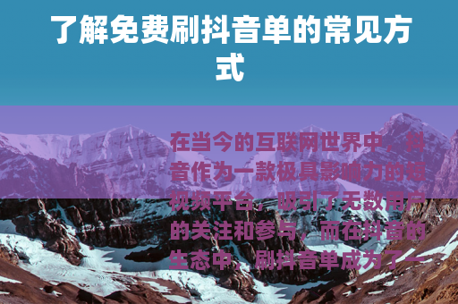 在当今的互联网世界中,抖音作为一款极具影响力的短视频平台,吸引了无数用户的关注和参与,而在抖音的生态中,刷抖音单成为了一个热门话题,尤其是免费刷抖音单更是引起了许多人的兴趣。