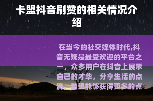在当今的社交媒体时代,抖音无疑是最受欢迎的平台之一,众多用户在抖音上展示自己的才华,分享生活的点滴,希望能够获得更多的点赞和关注,从而扩大自己的影响力,而卡盟抖音刷赞这一现象也随之出现。