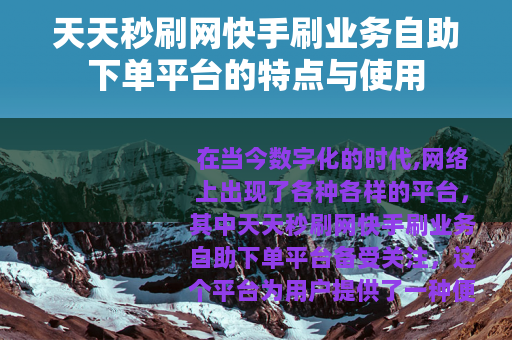 在当今数字化的时代,网络上出现了各种各样的平台,其中天天秒刷网快手刷业务自助下单平台备受关注,这个平台为用户提供了一种便捷的方式来处理快手相关业务的下单操作。