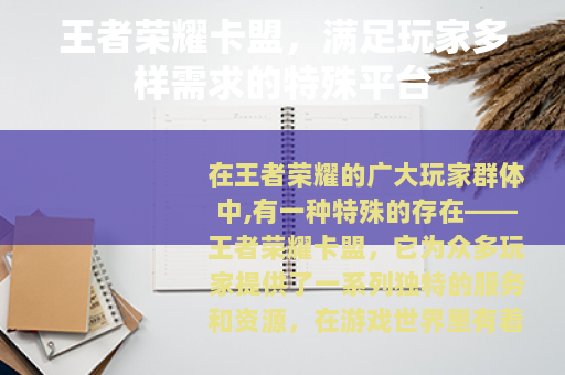 在王者荣耀的广大玩家群体中,有一种特殊的存在——王者荣耀卡盟,它为众多玩家提供了一系列独特的服务和资源,在游戏世界里有着自己的一席之地。