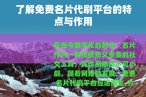 在当今数字化的时代,名片作为一种传统而又重要的社交工具,其作用依然不可小觑,随着网络的发展,免费名片代刷平台应运而生,为众多用户提供了一种全新的名片推广方式。