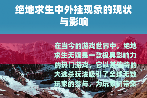 在当今的游戏世界中,绝地求生无疑是一款极具影响力的热门游戏,它以其独特的大逃杀玩法吸引了全球无数玩家的参与,为玩家们带来了紧张刺激的游戏体验,伴随着游戏的火爆,外挂问题也日益凸显,成为了游戏领域中一个备受关注的现象。