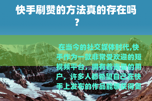 在当今的社交媒体时代,快手作为一款非常受欢迎的短视频平台,拥有着海量的用户,许多人都希望自己在快手上发布的作品能够获得更多的点赞,从而获得更多的关注和流量,一些人就开始好奇,快手刷赞怎么刷50 呢?