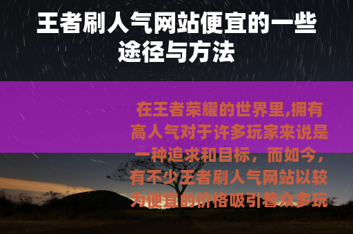 王者刷人气网站便宜的特点为众多玩家提供了一种快速提升人气的途径,它在一定程度上满足了玩家对于高人气的追求,为玩家的游戏生活带来了更多的乐趣和可能性,无论是个人玩家还是战队,都可以根据自己的需求和实际情况,合理利用这些刷人气网站,让自己在王者荣耀的世界中更加闪耀,但同时也要保持理性和谨慎,确保自己的游戏之旅能够健康、快乐地进行下去。
