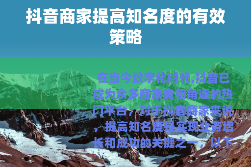 在当今数字化时代,抖音已成为众多商家竞相角逐的热门平台,对于抖音商家来说,提高知名度是实现业务增长和成功的关键之一,以下是一些可以帮助抖音商家提高知名度的有效方法。 的创作至关重要,商家需要深入了解自己的目标受众,明确他们的兴趣和需求,从而制作出能够吸引他们的视频内容,无论是有趣的短剧、实用的教程还是精美的产品展示,都要确保内容具有独特性和价值,能够在海量的抖音视频中脱颖而出,一家服装商家可以通过展示不同风格的服装搭配,以及分享穿搭技巧,吸引时尚爱好者的关注。