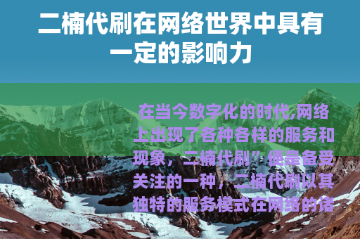 在当今数字化的时代,网络上出现了各种各样的服务和现象,二楠代刷”便是备受关注的一种,二楠代刷以其独特的服务模式在网络的诸多领域中崭露头角。