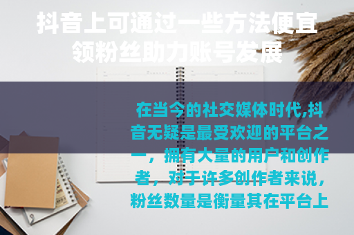 在当今的社交媒体时代,抖音无疑是最受欢迎的平台之一,拥有大量的用户和创作者,对于许多创作者来说,粉丝数量是衡量其在平台上影响力和成功的重要指标之一,很多人都在寻找各种途径来增加自己的粉丝量,而抖音便宜领粉丝的方法也成为了不少人关注的焦点。