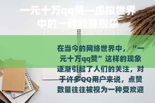 在当今的网络世界中,“一元十万qq赞”这样的现象逐渐引起了人们的关注,对于许多QQ用户来说,点赞数量往往被视为一种受欢迎程度和影响力的象征,而“一元十万qq赞”的出现,无疑为那些渴望快速提升自己QQ空间或说说点赞数的人提供了一种看似便捷的途径。