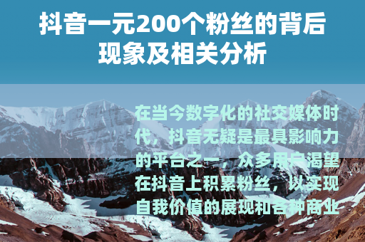 在当今数字化的社交媒体时代,抖音无疑是最具影响力的平台之一,众多用户渴望在抖音上积累粉丝,以实现自我价值的展现和各种商业目的,而市场上出现了一种声称一元能买到200个粉丝的现象,这引起了广泛的关注和讨论。