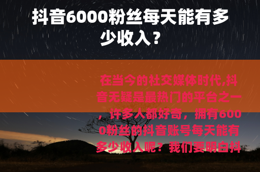 在当今的社交媒体时代,抖音无疑是最热门的平台之一,许多人都好奇,拥有6000粉丝的抖音账号每天能有多少收入呢?
