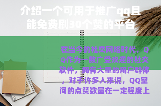 在当今的社交网络时代,QQ作为一款广受欢迎的社交软件,拥有大量的用户群体,对于许多人来说,QQ空间的点赞数量在一定程度上代表着自己的人气和受欢迎程度,很多人都希望能够找到一种有效的方式来增加自己QQ空间的点赞数,从而让自己在社交圈中更受关注,就给大家介绍一个刷赞免费平台,它可以帮助大家轻松获得30个赞,为QQ空间的推广助力。