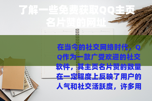 在当今的社交网络时代,QQ作为一款广受欢迎的社交软件,其主页名片赞的数量在一定程度上反映了用户的人气和社交活跃度,许多用户都希望能够增加自己QQ主页名片的赞数,而免费获取赞的网址也因此受到了不少人的关注。