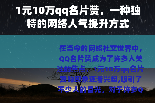 在当今的网络社交世界中,QQ名片赞成为了许多人关注的焦点,1元10万qq名片赞的现象逐渐兴起,吸引了不少人的目光。