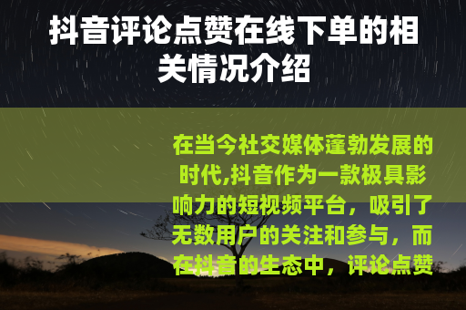 在当今社交媒体蓬勃发展的时代,抖音作为一款极具影响力的短视频平台,吸引了无数用户的关注和参与,而在抖音的生态中,评论点赞成为了衡量一个视频热度和受欢迎程度的重要指标之一,随着需求的增加,抖音评论点赞在线下单的服务也应运而生。