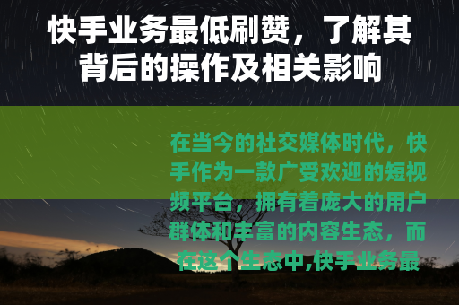 在当今的社交媒体时代,快手作为一款广受欢迎的短视频平台,拥有着庞大的用户群体和丰富的内容生态,而在这个生态中,快手业务最低刷赞也成为了一个备受关注的话题。
