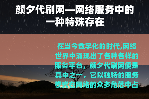 在当今数字化的时代,网络世界中涌现出了各种各样的服务平台,颜夕代刷网便是其中之一,它以独特的服务模式在网络的众多角落中占据了一席之地。