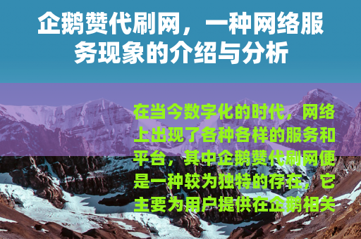 在当今数字化的时代,网络上出现了各种各样的服务和平台,其中企鹅赞代刷网便是一种较为独特的存在,它主要为用户提供在企鹅相关平台上增加点赞数量等服务,在一定程度上满足了部分用户对于社交平台数据增长的需求。