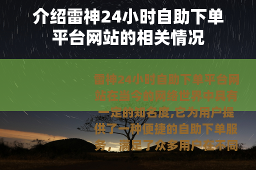 雷神24小时自助下单平台网站在当今的网络世界中具有一定的知名度,它为用户提供了一种便捷的自助下单服务,满足了众多用户在不同需求方面的交易需求。