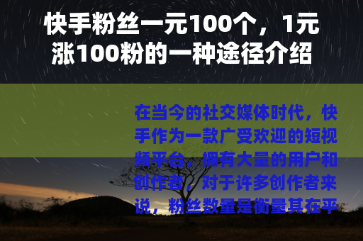 在当今的社交媒体时代,快手作为一款广受欢迎的短视频平台,拥有大量的用户和创作者,对于许多创作者来说,粉丝数量是衡量其在平台上影响力和受欢迎程度的重要指标之一,而“快手粉丝一元100个,1元涨100粉”这样的现象也逐渐引起了人们的关注。