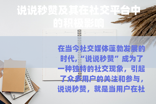 说说秒赞作为社交平台上的一种常见现象,在增强用户自信、促进互动交流、提升平台粘性、传递社交信号以及满足心理需求等方面都发挥着积极的作用,我们应该正确看待和利用这一现象,让它成为我们社交生活中的有益补充,在享受社交乐趣的同时,不断提升自己的社交能力和生活品质。