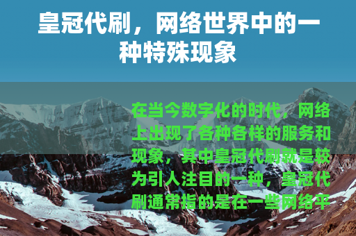 在当今数字化的时代,网络上出现了各种各样的服务和现象,其中皇冠代刷就是较为引人注目的一种,皇冠代刷通常指的是在一些网络平台上,通过特定的技术手段或人工操作,帮助用户提升其在特定系统中的等级或积分,使其获得皇冠等高级标识,从而在相应的平台中获得更多的关注和权益。