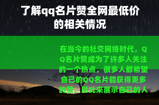 在当今的社交网络时代,QQ名片赞成为了许多人关注的一个热点,很多人都希望自己的QQ名片能获得更多的赞,以此来展示自己的人气和社交魅力,而在众多提供QQ名片赞服务的平台中,全网最低价的选项尤其受到大家的青睐。