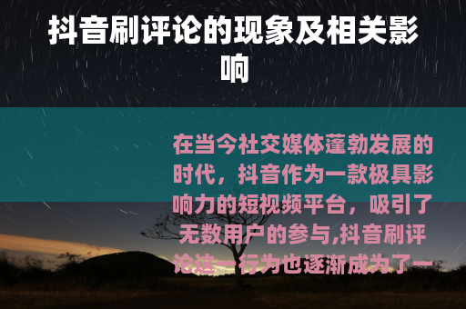 在当今社交媒体蓬勃发展的时代,抖音作为一款极具影响力的短视频平台,吸引了无数用户的参与,抖音刷评论这一行为也逐渐成为了一个备受关注的话题。