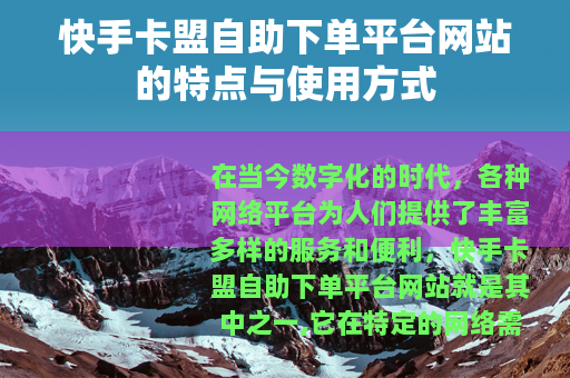 在当今数字化的时代,各种网络平台为人们提供了丰富多样的服务和便利,快手卡盟自助下单平台网站就是其中之一,它在特定的网络需求领域中有着独特的地位和作用。