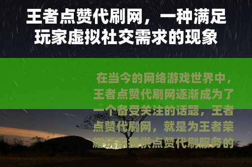 在当今的网络游戏世界中,王者点赞代刷网逐渐成为了一个备受关注的话题,王者点赞代刷网,就是为王者荣耀玩家提供点赞代刷服务的平台,它的出现,满足了一部分玩家在游戏社交方面的特定需求。