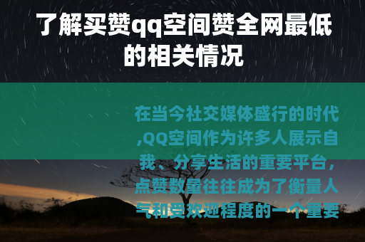在当今社交媒体盛行的时代,QQ空间作为许多人展示自我、分享生活的重要平台,点赞数量往往成为了衡量人气和受欢迎程度的一个重要指标,市场上出现了一种声称能提供全网最低价格买赞服务的现象,也就是买赞qq空间赞全网最低的业务。