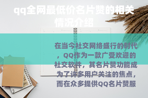 在当今社交网络盛行的时代,QQ作为一款广受欢迎的社交软件,其名片赞功能成为了许多用户关注的焦点,而在众多提供QQ名片赞服务的商家中,全网最低价名片赞更是吸引了不少人的目光。