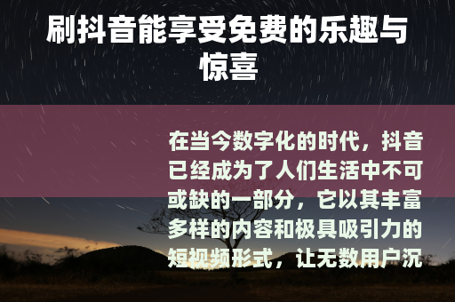 刷抖音没事免费,它为我们的生活带来了更多的乐趣和价值,它让我们在忙碌的生活中,能够找到一个轻松愉悦的休闲方式,同时还能享受到各种免费的福利和资源,无论是消费者、学习者还是创作者,都能在抖音这个平台上找到属于自己的免费宝藏,让我们的生活变得更加丰富多彩,让我们继续在抖音的世界里畅游,尽情享受这免费的快乐时光吧。