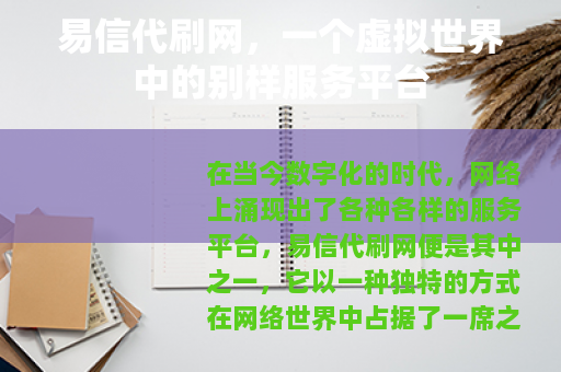 在当今数字化的时代,网络上涌现出了各种各样的服务平台,易信代刷网便是其中之一,它以一种独特的方式在网络世界中占据了一席之地,为众多用户提供着别样的服务体验。
