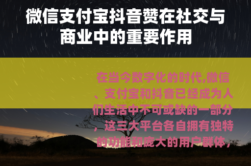 在当今数字化的时代,微信、支付宝和抖音已经成为人们生活中不可或缺的一部分,这三大平台各自拥有独特的功能和庞大的用户群体,而其中的“赞”这一元素更是在社交和商业领域发挥着重要的作用。
