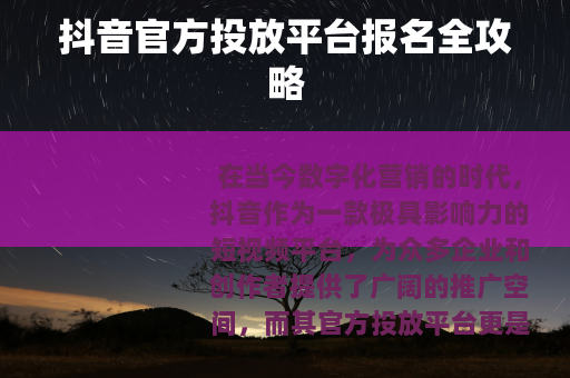 在当今数字化营销的时代,抖音作为一款极具影响力的短视频平台,为众多企业和创作者提供了广阔的推广空间,而其官方投放平台更是助力大家实现精准营销、提升品牌知名度和产品销量的有力工具,我们就来详细了解一下抖音官方投放平台报名的相关事宜。