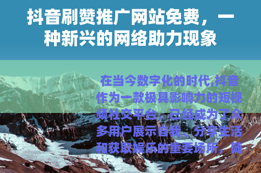 在当今数字化的时代,抖音作为一款极具影响力的短视频社交平台,已经成为了众多用户展示自我、分享生活和获取娱乐的重要场所,随着其用户群体的不断扩大和商业价值的日益凸显,抖音刷赞推广网站免费这一现象也逐渐走进了人们的视野。