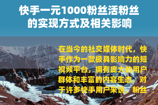 在当今的社交媒体时代,快手作为一款极具影响力的短视频平台,拥有庞大的用户群体和丰富的内容生态,对于许多快手用户来说,粉丝数量是衡量其在平台上影响力和受欢迎程度的一个重要指标。“快手一元1000粉丝活粉丝”这样的说法在一些网络角落中流传开来,引起了不少人的关注。