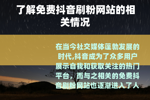 在当今社交媒体蓬勃发展的时代,抖音成为了众多用户展示自我和获取关注的热门平台,而与之相关的免费抖音刷粉网站也逐渐进入了人们的视野。