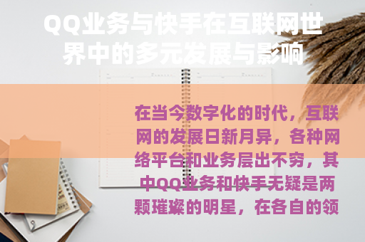 QQ业务和快手在互联网的世界中都有着不可替代的地位和作用,它们以各自独特的方式满足了用户的需求,创造了丰富的价值,在未来的发展中,它们将继续紧跟时代的步伐,不断创新和发展,为用户带来更多的惊喜和改变,成为人们数字生活中不可或缺的一部分,无论是在社交、娱乐、文化传播还是商业等领域,QQ业务和快手都将继续发挥重要的作用,推动互联网行业不断向前发展,为社会的进步和发展做出更大的贡献。