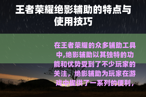 王者荣耀绝影辅助是一款具有一定特色和优势的辅助工具,它在视野、技能释放、资源获取和团队协作等方面都能为玩家提供有力的支持,帮助玩家在游戏中取得更好的表现,但玩家要正确地认识和使用它,不断提升自己的能力,以积极的心态享受游戏的乐趣,在王者荣耀的世界里创造属于自己的辉煌。