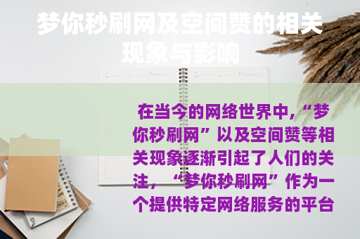 在当今的网络世界中,“梦你秒刷网”以及空间赞等相关现象逐渐引起了人们的关注。“梦你秒刷网”作为一个提供特定网络服务的平台,在一定程度上满足了部分用户对于空间赞等数据增长的需求。