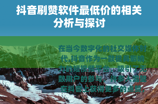 在当今数字化的社交媒体时代,抖音作为一款极具影响力的短视频平台,吸引了无数用户的参与,许多人渴望在抖音上获得更多的点赞,以提升自己作品的热度和影响力,这也使得市场上出现了各种声称能提供抖音刷赞服务且价格最低的软件。
