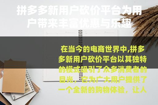 在当今的电商世界中,拼多多新用户砍价平台以其独特的模式吸引了众多消费者的目光,它为广大用户提供了一个全新的购物体验,让人们在享受购物的同时,还能通过砍价的方式获得更多的实惠。