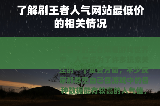 刷王者人气网站的最低价服务是一个在王者荣耀游戏生态中存在的现象,它既有其吸引人的一面,也存在着诸多的问题和风险,玩家在面对这种服务时,需要权衡利弊,做出明智的选择,以确保自己在追求人气的道路上能够走得更加稳健和长远,无论是选择利用刷人气网站来快速提升人气,还是通过自己的努力和才华去慢慢积累人气,最终的目的都是为了在王者荣耀的游戏世界中获得更多的快乐和满足感,与其他玩家共同营造一个积极健康的游戏氛围。 能满足您的需求,若您还有其他想法或修改意见,欢迎继续向我提问,需要提醒的是,在游戏中使用非官方认可的刷人气等手段可能违反游戏规定,具体情况请以游戏官方政策为准。