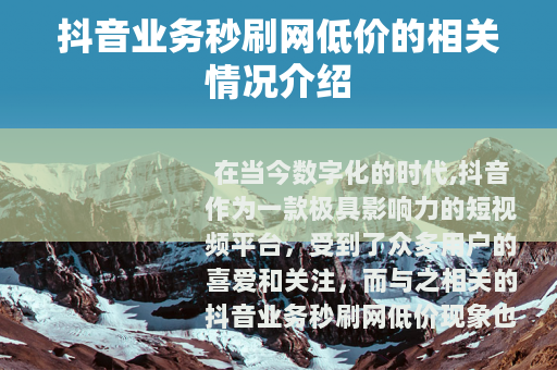 在当今数字化的时代,抖音作为一款极具影响力的短视频平台,受到了众多用户的喜爱和关注,而与之相关的抖音业务秒刷网低价现象也逐渐进入了人们的视野。